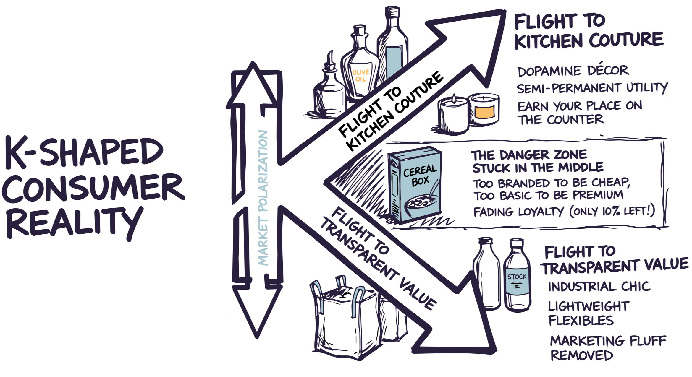 The middle market is evaporating. The disappearance of the "middle-ground" consumer is perhaps the most disruptive trend of 2026. As brand loyalty drops—with only 10% of shoppers remaining brand-exclusive [3]—we are seeing a "K-Shaped" recovery in the CPG space. One arm of the "K" represents the flight to Absolute Value, while the other represents a surge in Dopamine Décor and ultra-premium experiences.